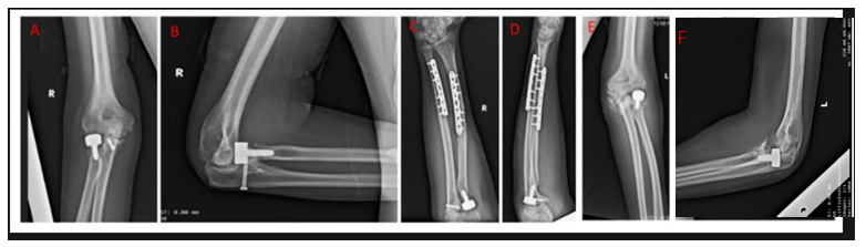 Figure 5: Post-operative follow up (at 6 months) X-rays of right elbow (a) anteroposterior and (b) lateral view, right forearm (c) anteroposterior and (d) lateral view, and left elbow (e) anteroposterior and (f) lateral view.