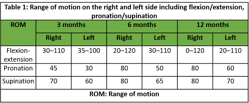 Follow-up was done at 2 weeks, 6 weeks, 3 months, 6 months, and 12 months postoperatively. They were examined clinically, and a radiographic and functional outcome was done using different scores. During the first 8 weeks, the range of mobility increased by 10°/week. At the end of 3 months, both functional and radiological outcomes were satisfactory (Fig. 4). The ROM on the right and left side, including flexion/extension, pronation/supination, was measured and documented at 3, 6, and 12 months (Table 1).