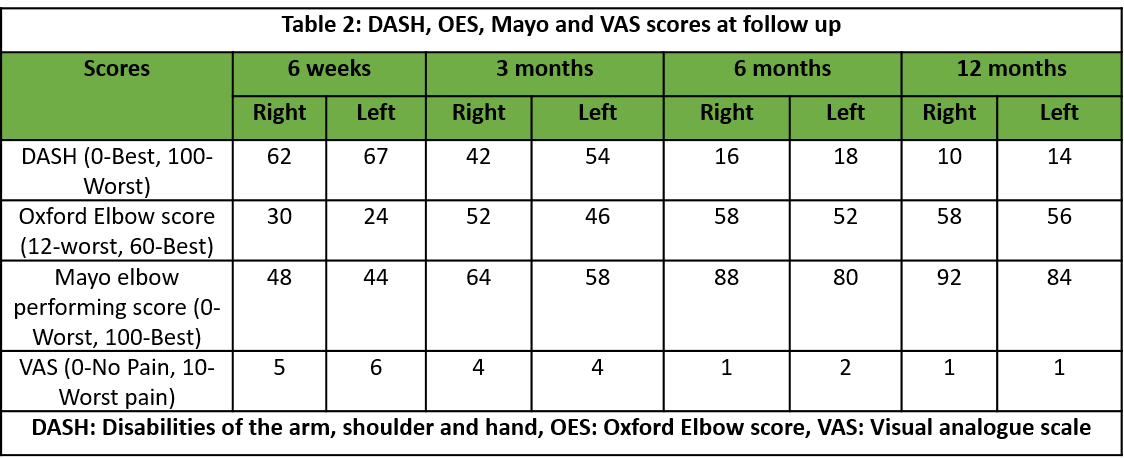Both elbows were stable at the follow-up of the patient at the outpatient department, indicating a positive outcome. In addition, functional recovery was assessed using the Oxford Elbow score (OES), a validated tool for measuring elbow function and quality of life. The patient had progressive improvement in OES, disabilities of the arm, shoulder, and hand (DASH), and Mayo scores, reflecting enhanced function and overall satisfaction with the surgical outcome (Table 2).