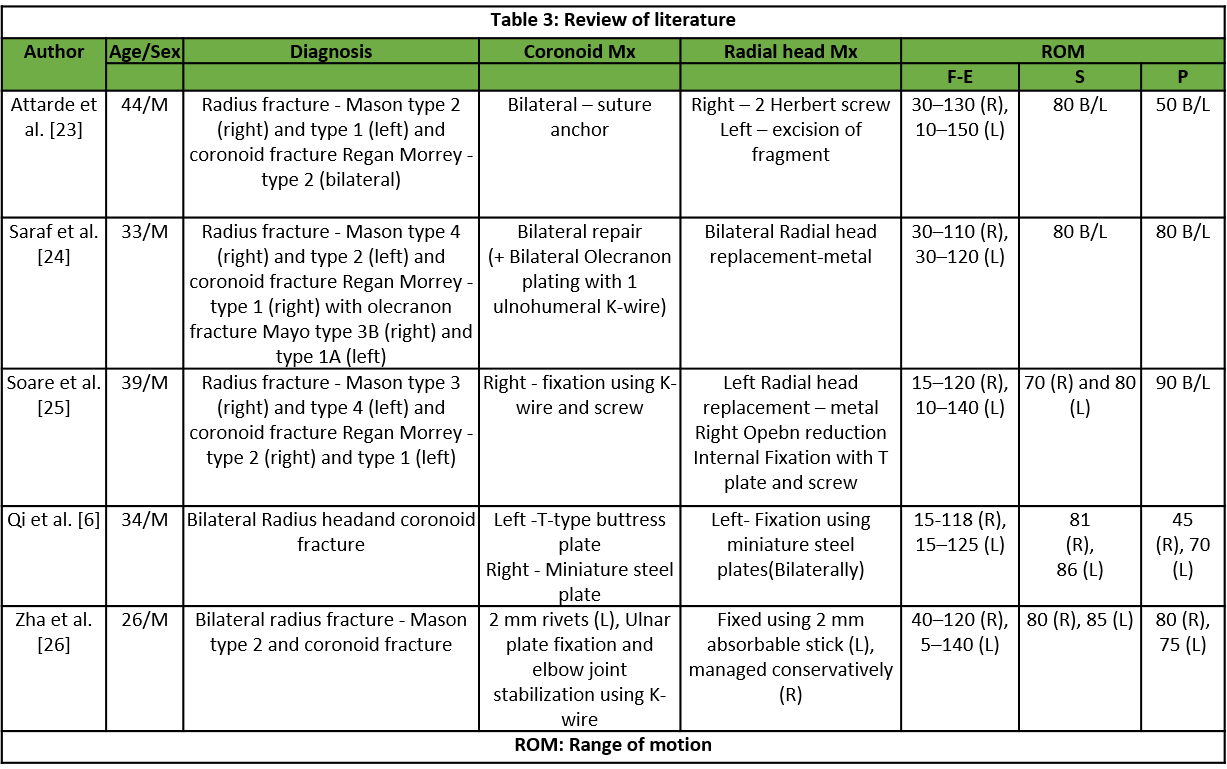 The mechanism of injury plays a crucial role in determining the severity of a terrible triad injury. This complex injury follows a specific sequence of events. In this case, the patient fell from a height with the elbows extended and the forearms in supination. The axial force transmitted through the ulna-humeral joint led to a posterior dislocation, resulting in fractures of both the radial head and the coronoid process. The primary goals in treating a terrible triad injury are to restore elbow joint congruency, ensure stability, and enable early mobility to prevent complications. Standard treatment protocols, such as those proposed by Pugh et al., [7] focus on anatomical restoration of the humeroradial joint, reduction and fixation of the coronoid process fracture, and repair of the joint capsule and ligamentous injuries, including the lateral collateral ligament and, when necessary, the medial collateral ligament (MCL). Few cases have been published in the past; the summary of the same is shown in Table 3.