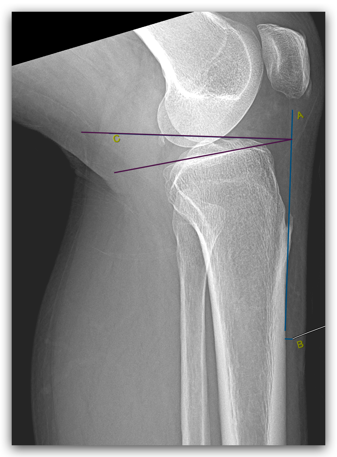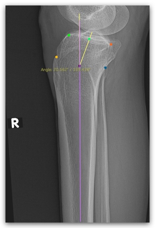 Standardized anteroposterior and lateral radiographs of the affected knees were obtained in a weight-bearing position. The landmarks in the study included the tibial tuberosity, patella, and femoral condyles. DICOM software or the Angulus mobile app was used to analyze “Posterior Tibial Slope” and “Metaphysio-Diaphyseal Angle” after the radiographs were taken.