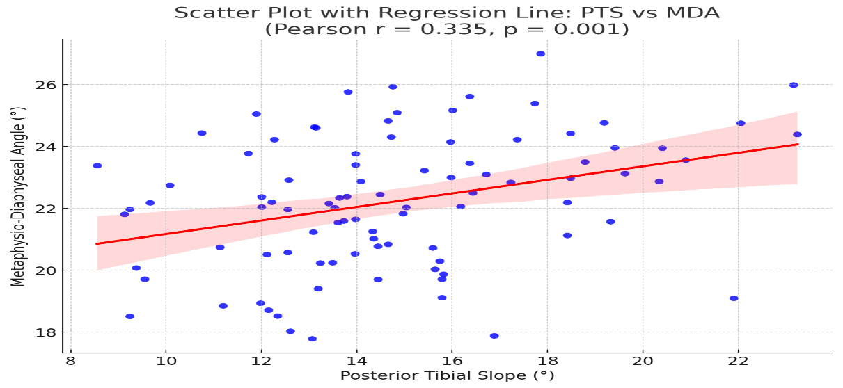 There is a statistically significant moderate positive correlation between PTS and MDA (r = 0.335, P < 0.01). This indicates that as the “PTS increases,” the “MDA tends to increase” as well. The relationship, while not strong, is meaningful and suggests a biomechanical link that may warrant further exploration in osteoarthritic knee evaluation and surgical planning (Table 1 and Graph 1).