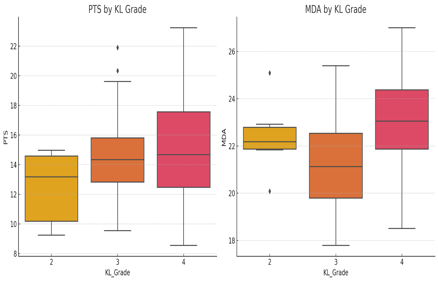 MDA shows a moderate positive correlation with KL grade, indicating that as OA severity increases (KL grade), the MDA tends to increase significantly. PTS, on the other hand, shows only a weak and statistically insignificant correlation with KL grade (Table 3).