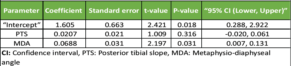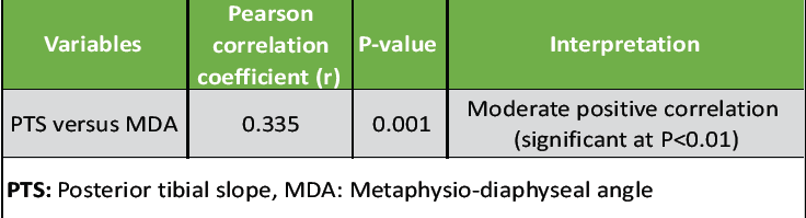 An important finding is that there is a weak but positive relationship between PTS and MDA (r = 0.335, P < 0.01). Mohanty et al. [16] commented similarly that combined changes in joint angles have impacts on joint movements and can lead to problems when setting up prosthetics during TKA. It also confirms the theory of Goyal et al. [17] that the combination of MDA errors happening with a greater tibial slope (PTS) applies more pressure on either side of the knee, increasing the risk of OA.