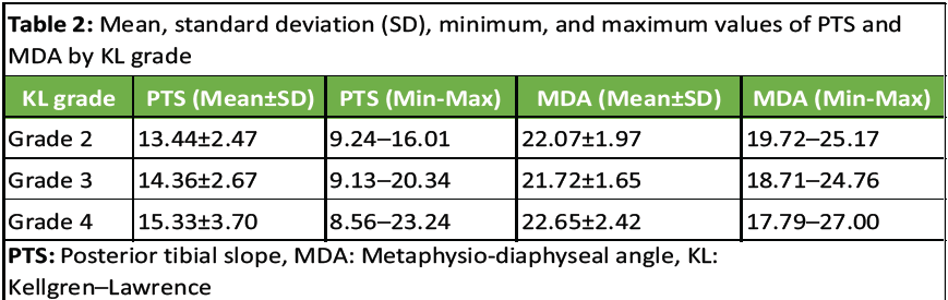 Keywords: Posterior tibial slope, metaphysio-diaphyseal angle, osteoarthritis, Kellgren–Lawrence, knee biomechanics, radiographic severity.