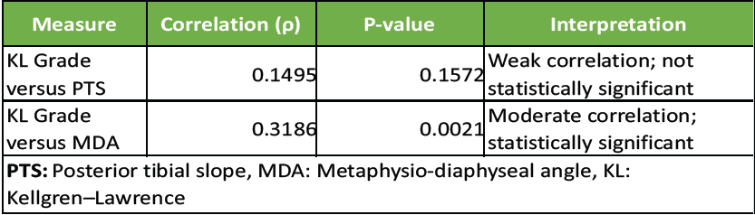 Results: The mean PTS was 14.67° (standard deviation [SD] ± 3.03), and the mean MDA was 22.22° (SD ± 2.20). PTS and MDA showed a moderate positive correlation (r = 0.335, P < 0.01). MDA was significantly associated with KL grades (ρ = 0.3186, P = 0.0021), whereas PTS showed no statistically significant correlation (P = 0.157). Multiple regression confirmed MDA as a significant predictor of KL grade (P = 0.031).