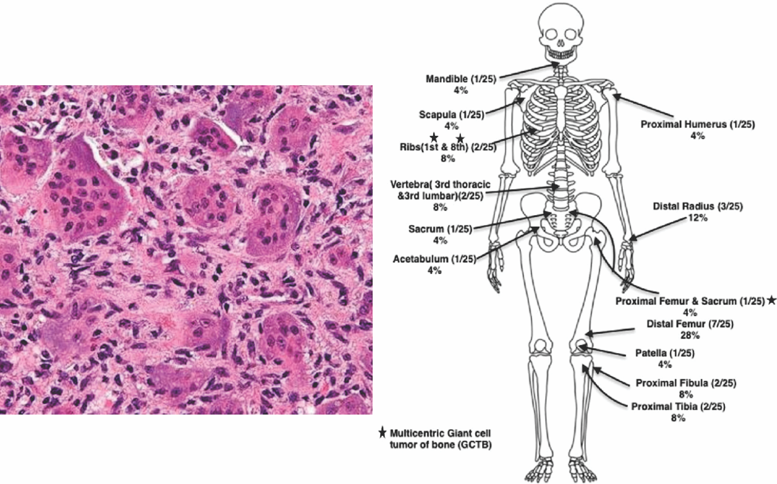 Figure 1: Histopathological appearance of giant cell tumor and its distribution across all bones.