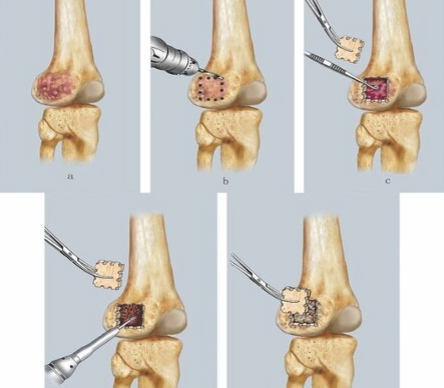Of all surgical techniques, bone curettage followed by cementing or bone grafting has been the most commonly practiced technique for GCT (Fig. 3). This technique involves raising a cortical osseous flap of affected bone. Then extended curettage of the lesion is done with a high-speed burr device, and phenol is used as an adjuvant. Electrocautery is used at margins for neutralizing marginal tumor cells. Finally, the lesion is filled with polymethyl methacrylate cement or bone graft. Ultimately, the defect was closed with the same osseous flap.