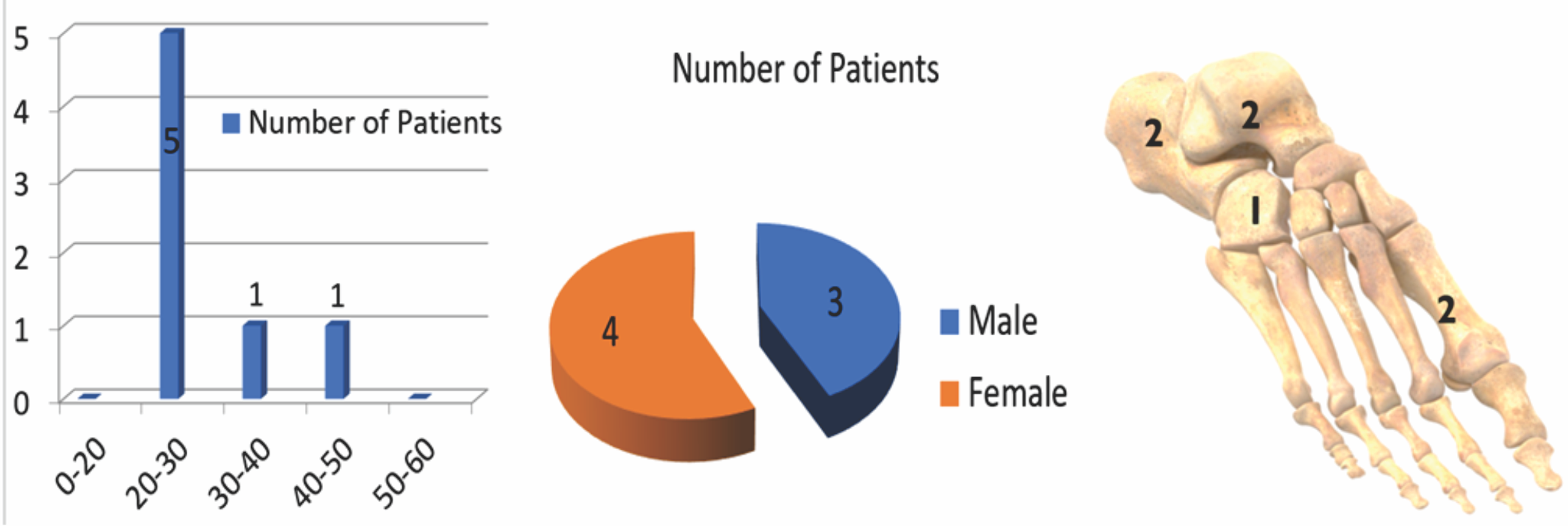 Figure 5: Age, sex distribution of patients and location of tumor in foot bones.