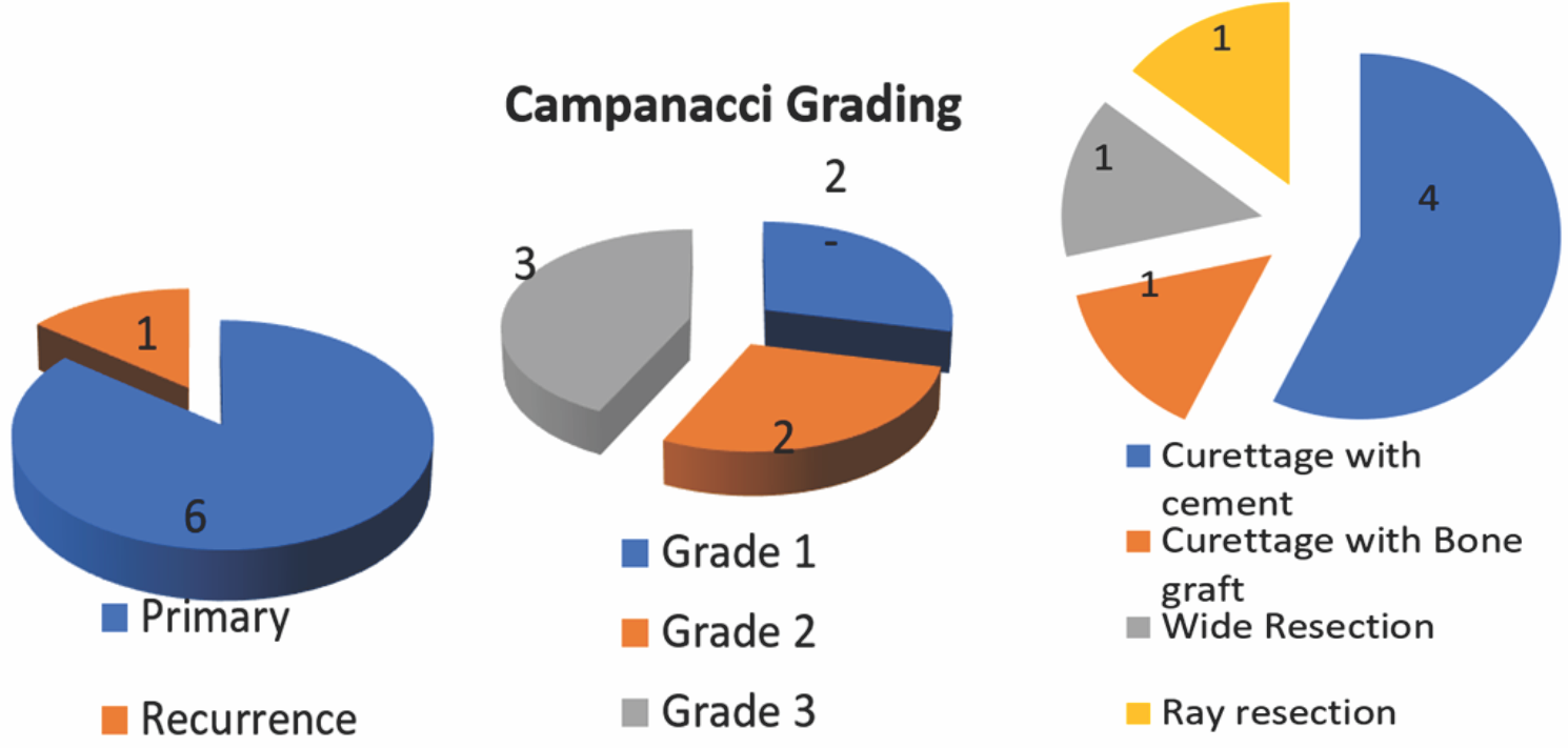 Out of 7 total cases, 6 cases were primary and 1 was recurrent (Fig. 6). Local recurrence of GCT was observed in the calcaneum at the previously operated site (in other hospital). As per the grading, there was Campanacci Grade 1 for 2 patients, Grade 2 for 2 patients and Grade 3 for 3 patients (Fig. 6). Out of 7 patients, 4 underwent curettage with cementing, 1 each underwent curettage with bone grafting, wide/marginal resection, and ray resection (Fig. 6).