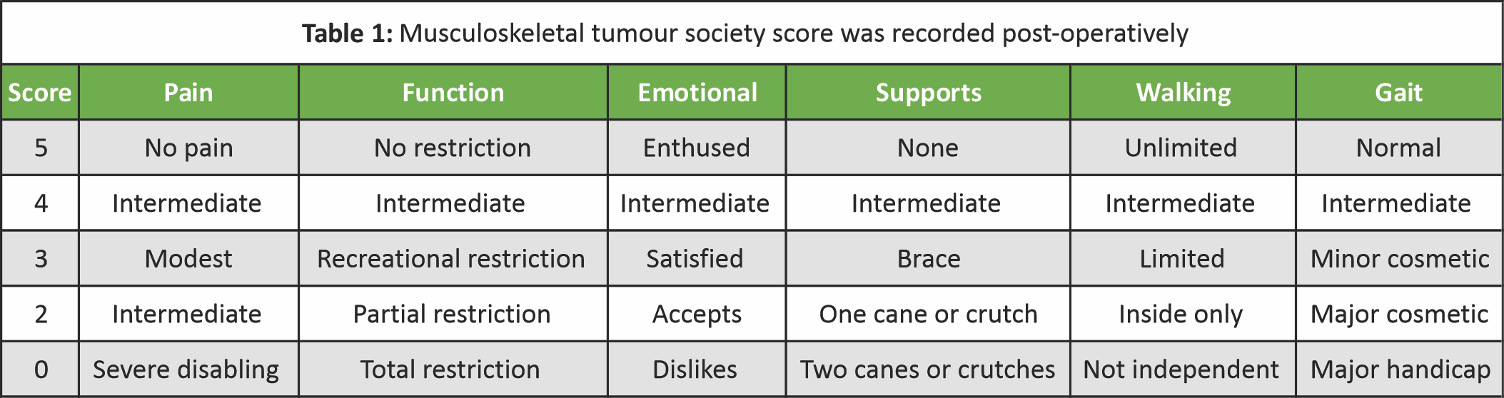 Musculoskeletal Tumour Society (MSTS) score was recorded postoperatively (Table 1).