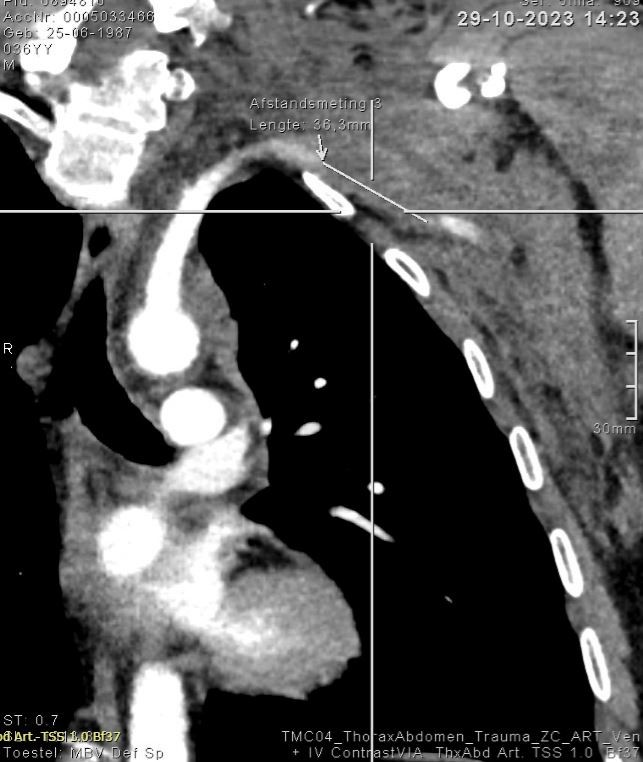 Visualization of a non definable portion of the left subclavian artery with a length of 36 mm.