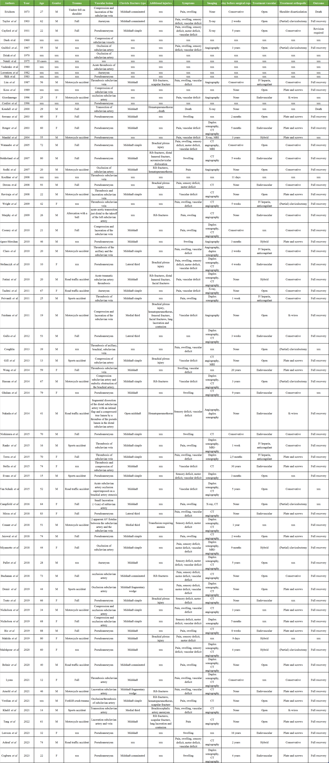 The first case of subclavian artery lesion combined with clavicle fracture was reported in 1873 by Erichsen after initial conservative treatment and subsequent decompression incisions and even shoulder disarticulation, the patient ultimately died [4]. Since then, 78 more cases of subclavian vessel injury combined with clavicular fractures after blunt trauma have been reported. An overview of the literature is presented in Table 1.
