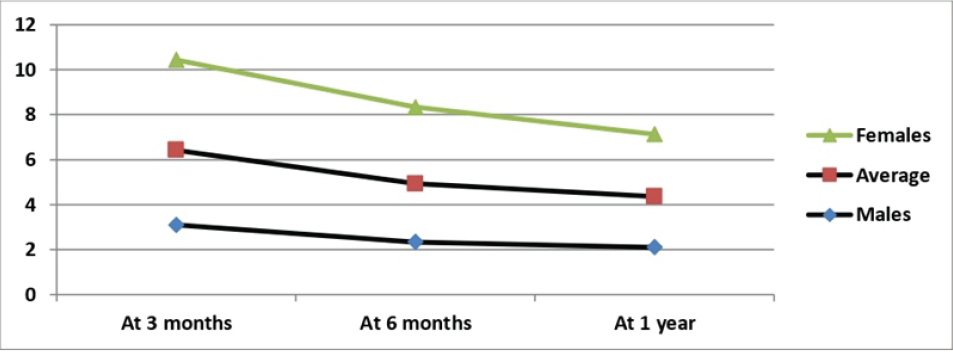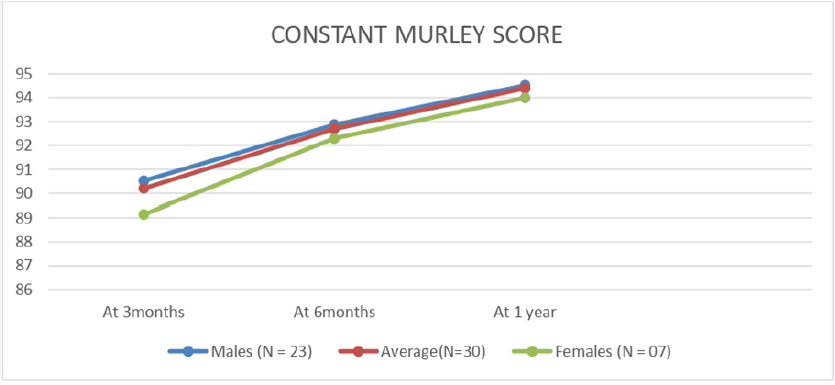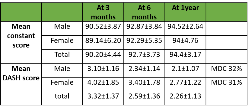 The DASH score in our study was observed to have a significant change postoperatively from 3 months to 1 year, i.e., 32% and 31% among males and females, respectively. Unlike purely clinical or radiological assessments, the DASH score reflects the patient’s subjective experience, capturing aspects such as pain, weakness, and difficulty in performing specific tasks. Following surgery, there was a marked reduction in DASH scores reflecting the restoration of shoulder function and alleviation of symptoms.
