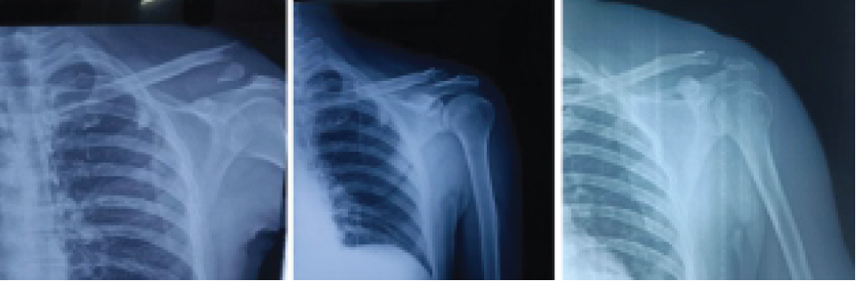 Figure 3: (a) X-ray showing Neers type 2 lateral end clavicle fracture. (b) X-ray showing 2 month post endobutton fixation. (c) X-ray showing 6-month post endobutton fixation.