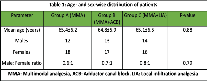 All 90 eligible patients were enrolled and equally randomized into three groups (n = 30 each): Group A (standard MMA), Group B (MMA + ACB), and Group C (MMA + LIA) through convenience sampling technique.