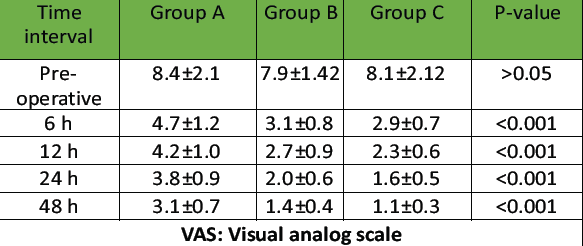 - Primary outcome: Post-operative pain intensity was assessed using the VAS (0–10 scale) at 6, 12, 24, and 48 h.