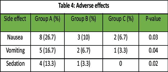 In our study, no statistically significant differences with respect to age, sex, and other sociodemographic profiles were observed. Opioid consumption (morphine equivalent dose) within 48 h was highest in Group A (29.5 ± 5.8 mg), followed by Group B (18.1 ± 4.3 mg), and lowest in Group C (12.3 ± 3.0 mg; P < 0.001) (Table 3). Adverse effects were more frequent in Group A, with nausea in 8 patients (26.7%), vomiting in 5 (16.7%), and sedation in 4 (13.3%), compared to Group C, which had nausea in 2 (6.7%), vomiting in 1 (3.3%), and no sedation (P < 0.05 for all) (Table 4).