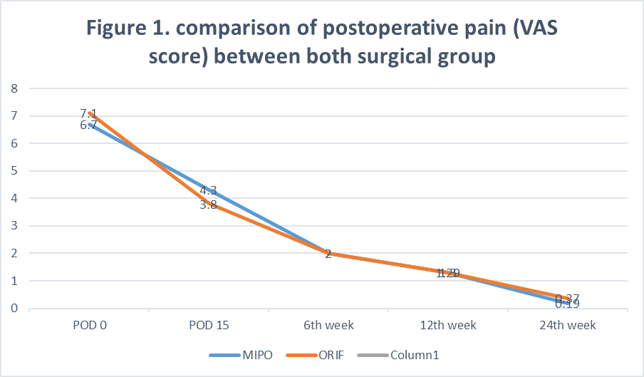 On post-operative day 0 (POD 0), all patients in the ORIF group and nearly 90% in the MIPO group reported severe pain. By day 15, about half of the ORIF group and over 90% of the MIPO group experienced severe to moderate pain, with a significant difference (P = 0.004). However, by the 6th, 12th, and 24th weeks, the trend reversed, showing nearly 40% with post-operative pain in the ORIF group and around 20% in the MIPO group at 24 weeks, though this difference was not statistically significant (Table 2 and Fig. 1).