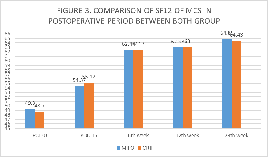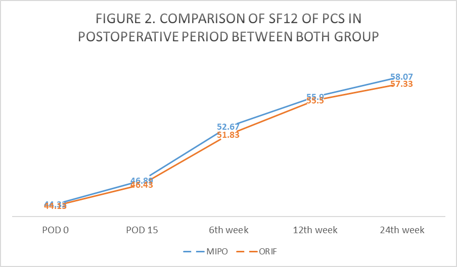 The ORIF group had a lower physical and mental SF-12 score at all post-operative follow-up periods and at POD 0 and the 24th week, though the difference was statistically insignificant (Table 3, Fig. 2 and 3).