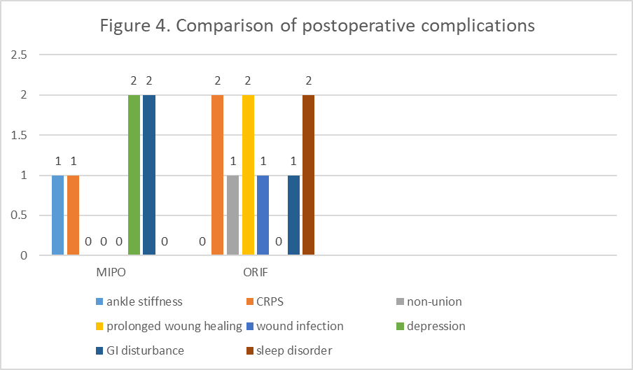 Surgery-related complications such as non-union, prolonged wound healing, and wound infection were more common among the ORIF group, but the difference was insignificant. The total sequelae or complications were lower in the MIPO group (22.2% versus 30%), but not significantly (Table 4 and Fig. 4).