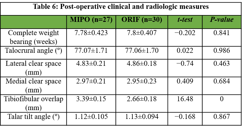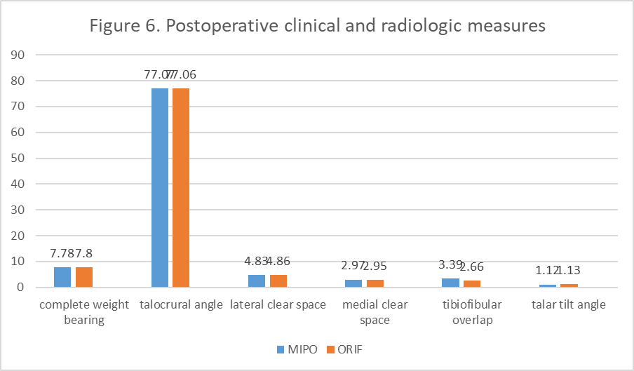 The duration for complete weight bearing was similar among the ORIF and MIPO group (7.8 ± 0.407 weeks vs. 7.78 ± 0.423 weeks). Radiological outcomes such as talocrural angle (77.08 ± 1.70° vs. 77.06 ± 1.71°), lateral clear space (4.86 ± 0.18 mm vs. 4.83 ± 0.21 mm), medial clear space (2.95 ± 0.23 mm vs. 2.97 ± 0.21 mm), and talar tilt angle (1.13±0.094° vs. 1.12 ± 0.105°) were also similar between both (ORIF and MIPO) groups. Only tibiofibular overlap had significant difference between two groups (2.66 ± 0.18 mm vs. 3.39 ± 0.15 mm, P < 0.001) (Table 6 and Fig. 6).