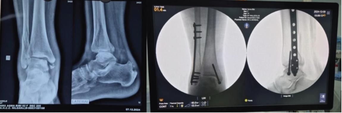 Figure 8: Pre-operative and immediate post-operative in a patient where minimally invasive percutaneous plate osteosynthesis fixation was done.