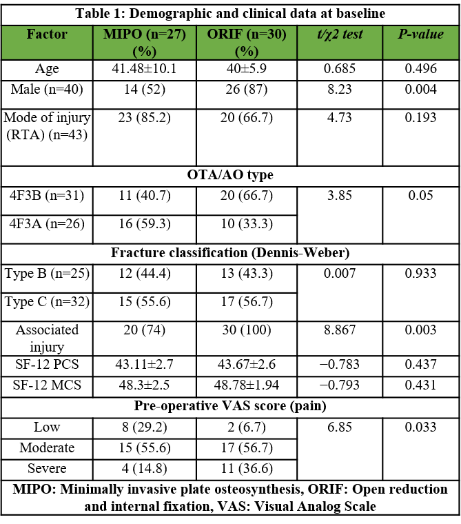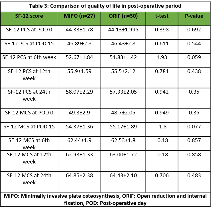 Results: The complication rate was higher in the ORIF group (30%) in comparison with the MIPO group (22.2%). Specific complications such as non-union, infections, and post-operative pain at the 24th week were more frequent in the ORIF group. The MIPO group showed better physical and mental SF-12 scores at various follow-ups. In addition, tibiofibular overlap was significantly lower in the ORIF group, while other radiological measures were similar across the two groups.
