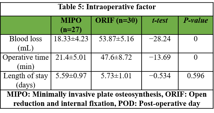 The mean blood loss during operation was higher in the ORIF group- 53.87 ± 5.16 mL versus 18.33 ± 4.23 mL in the MIPO group and statistically significant (P < 0.001). Similarly, the mean operative time was significantly higher among the ORIF group than the MIPO group (47.6 ± 8.72 min versus 21.4 ± 5.01 min, P < 0.001). The duration of hospital stay was also more in the ORIF group compared to the MIPO group (5.73 ± 1.01 days vs. 5.59 ± 0.97 days), though it was not significant (Table 5 and Fig. 5).