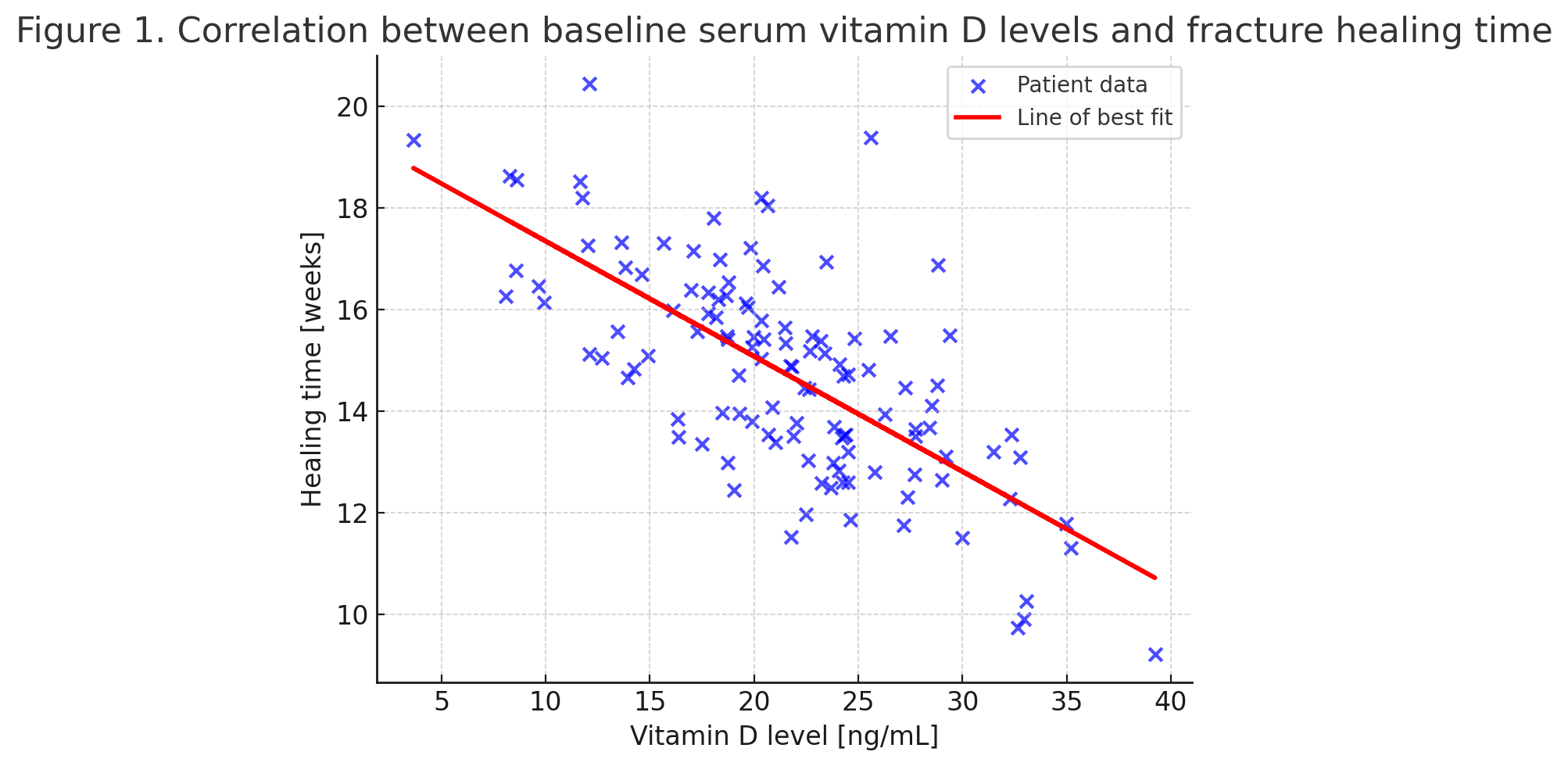 Figure 1: Scatter plot showing the correlation between baseline serum Vitamin D levels (ng/mL) and fracture healing time (weeks). The red line represents the line of best fit, demonstrating a significant negative correlation (r = −0.62, P < 0.001)