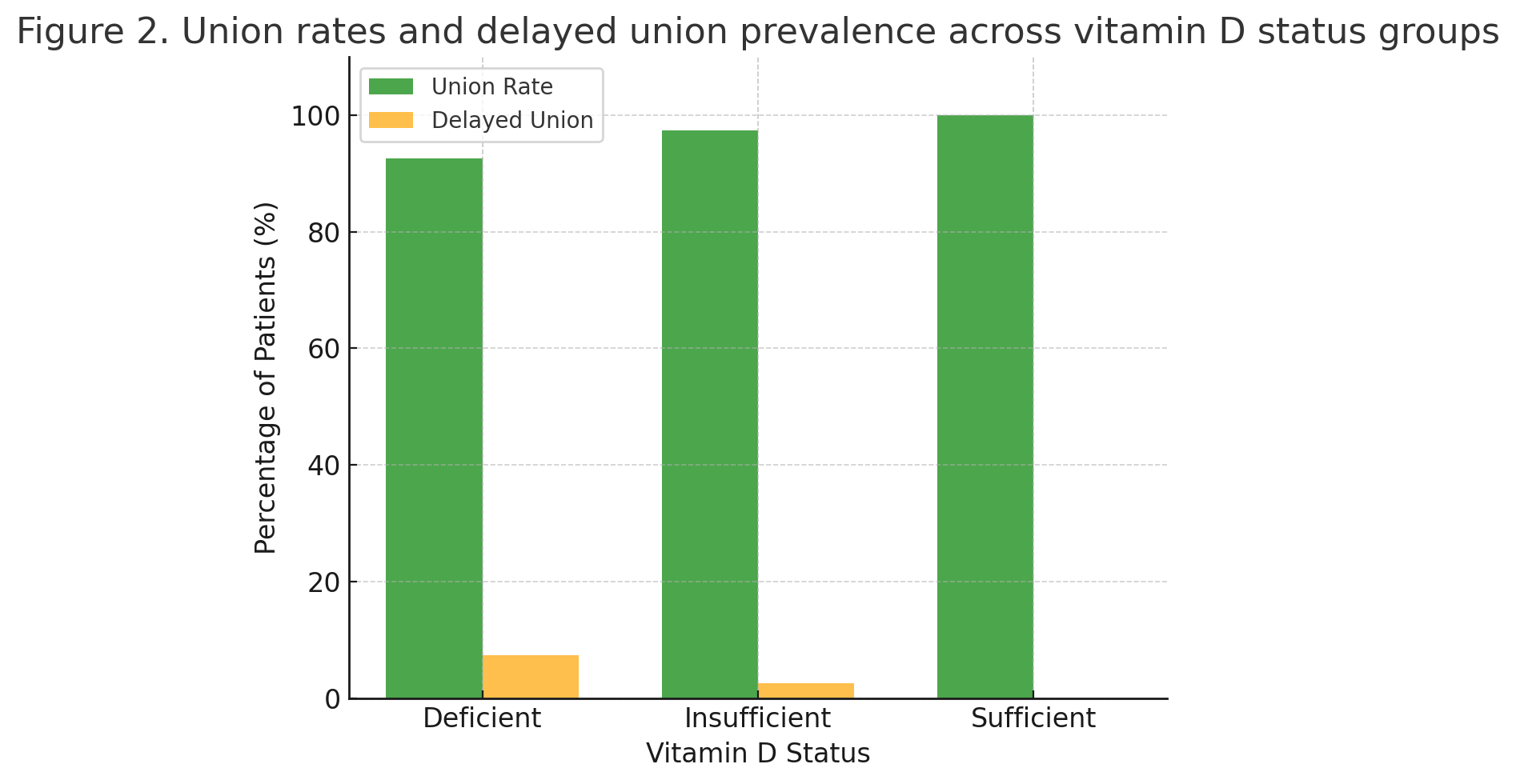 Figure 2: Bar chart comparing union rates and delayed union prevalence across Vitamin D status groups (deficient, insufficient, sufficient). Union rate is shown in green and delayed union prevalence in orange.