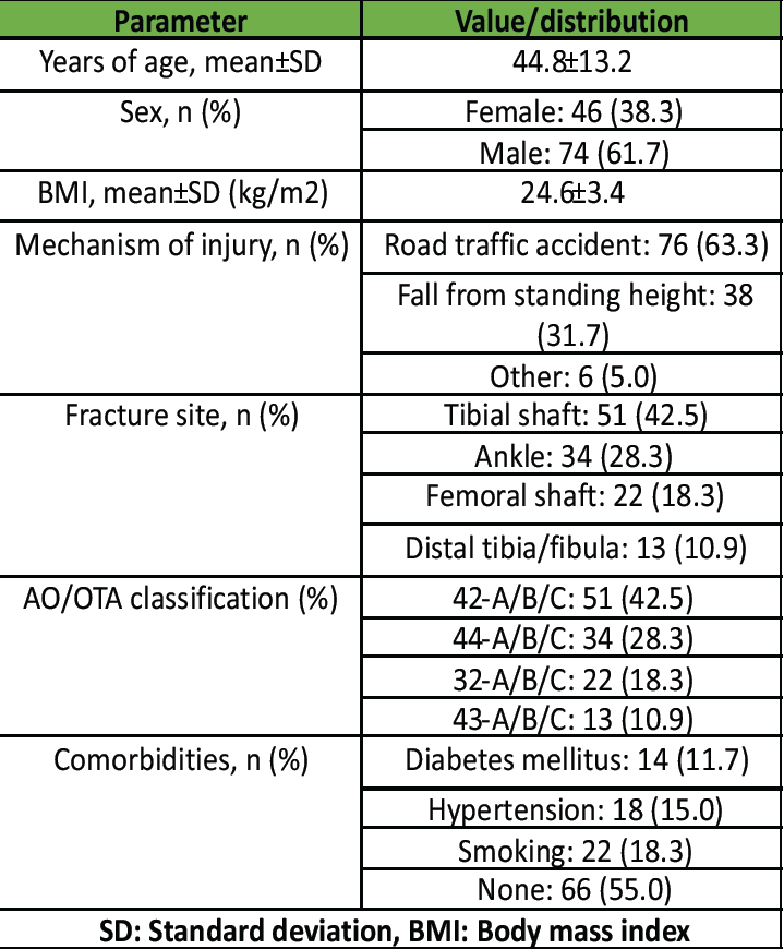 The investigation comprised 120 patients with acute fractures of the lower limbs. The study population had a male-to-female ratio of 1.6:1 and an average age of 44.8 ± 13.2 years. The most frequent fracture site was the tibial shaft (42.5%), which was followed by the distal tibia/fibula (10.9%), ankle (28.3%), and femoral shaft (18.3%). The leading causes of injuries were automobile accidents (63.3%), falls (31.7%), and other mechanisms (5.0%). Table 1 provides a summary of baseline characteristics.
