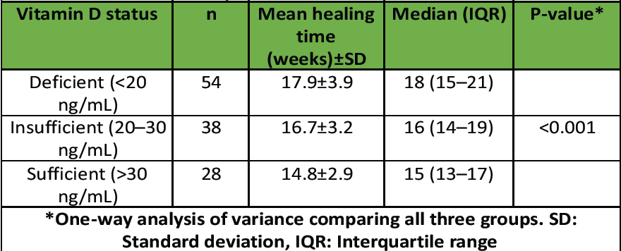 Data were entered into a secure database and analyzed using statistical software. Depending on the data distribution, continuous variables were either expressed as a median with interquartile range or as mean ± standard deviation. Frequencies and percentages were used to represent categorical variables. Pearson’s or Spearman’s correlation coefficients were used to evaluate the relationship between Vitamin D levels and healing times. The Student’s t-test, analysis of variance, or their non-parametric counterparts were used for group comparisons. P < 0.05 was regarded as statistically significant.