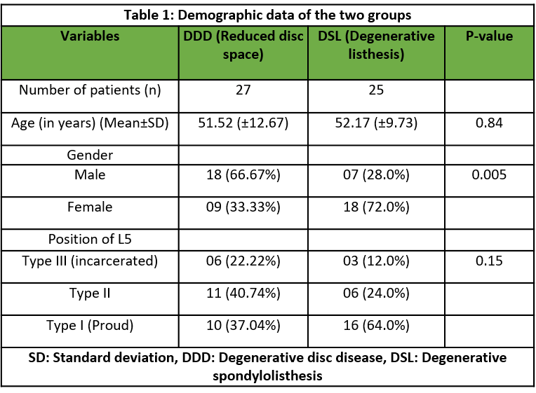 After excluding patients with missing data, a total of 52 patients were analyzed with 25 in group 1 and 27 in group 2. There were more females in group 1 as compared to group 2. Otherwise, they were quite similar in terms of age and station of L5 (Table 1).