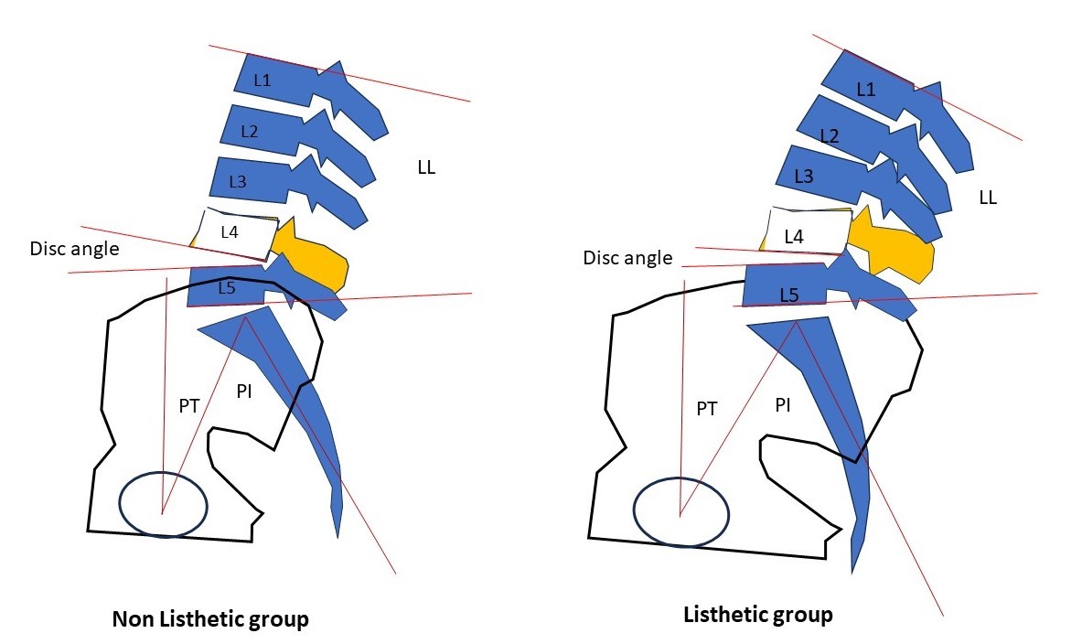 Keywords: Degenerative disc disease, degenerative spondylolisthesis, spino-pelvic parameters, disc angle, correlation.