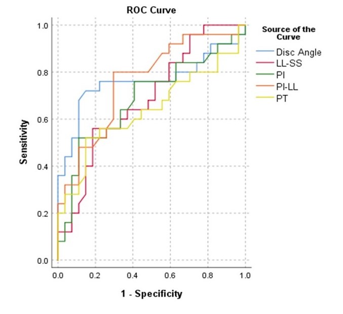 This table of multivariate logistic regression shows that the PI and disc angle have a significant impact on the outcome with adjusted odds ratio of 1.127 and 1.299, respectively. This means that the DSL group has a significantly higher value of PI and disc angle than DDD Group. A representative case and its graphical representation are given in Fig. 2 and 3.