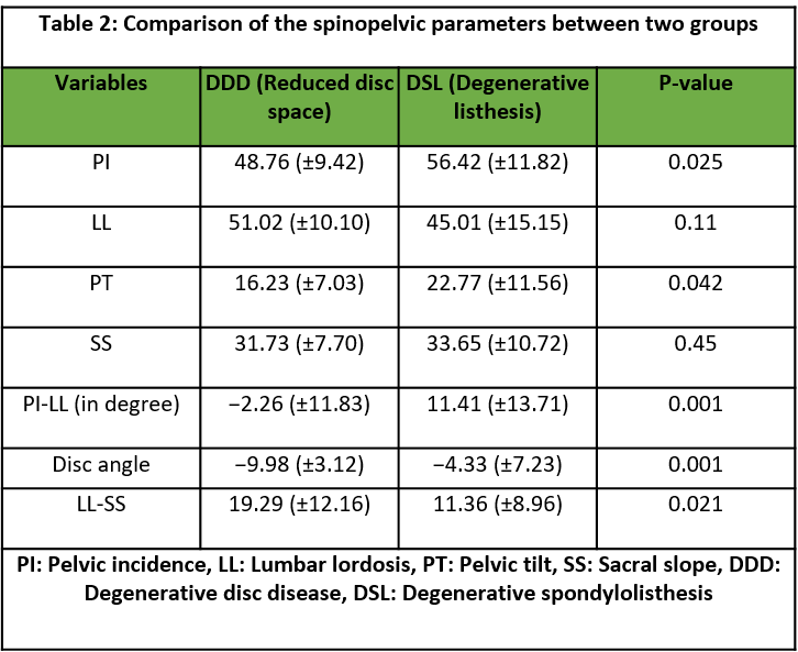 Keywords: Degenerative disc disease, degenerative spondylolisthesis, spino-pelvic parameters, disc angle, correlation.