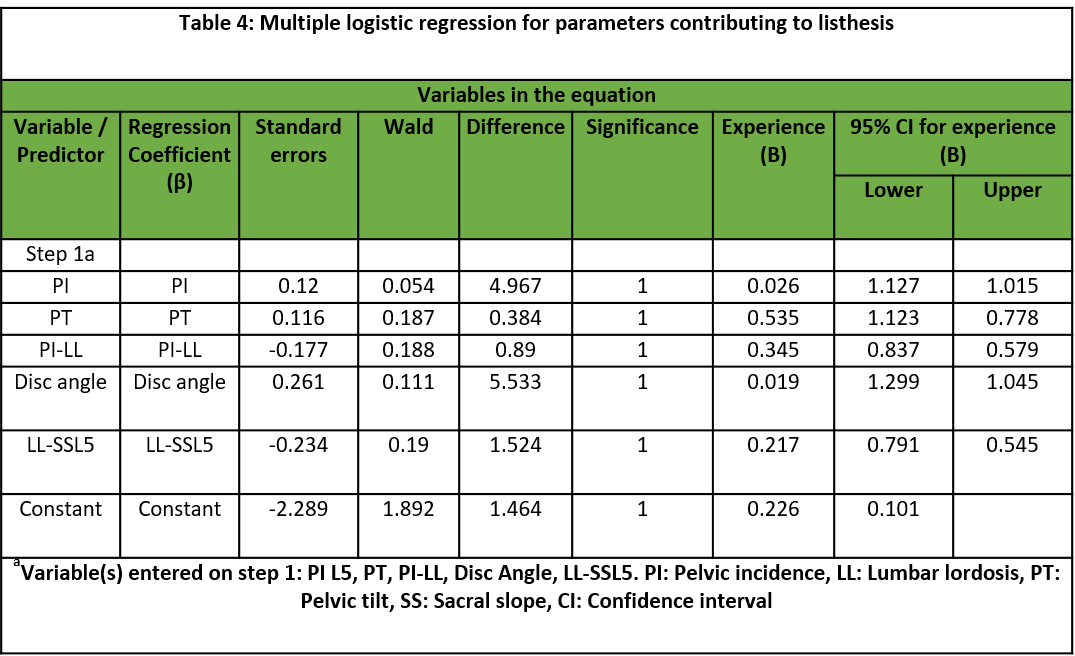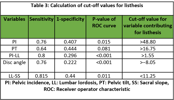 Materials and Methods: Between September 2021 and August 2024, 63 patients with a single-level degenerative pathology at L4-5 level were divided into DSL and non-listhesis group. Their SPPs, namely pelvic incidence (PI), pelvic tilt (PT), sacral slope (SS), lumbar lordosis (LL), disc angle, and position of L5 were studied on standing lumbosacral spine X-ray. The variables were compared between groups, receiver operator characteristic and cut-off points were calculated, and a multiple logistic regression was performed.