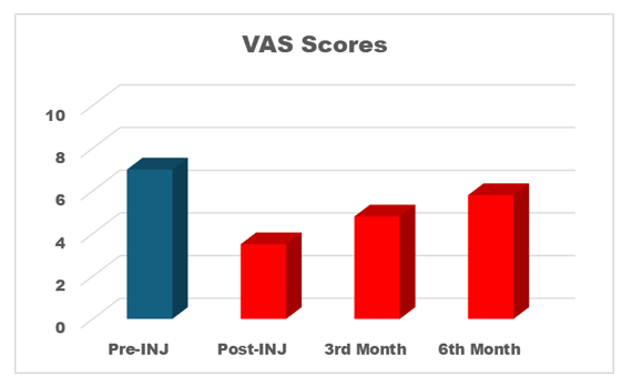 The VAS scores show a decrease in pain levels following an intervention. Pre-injection (Pre-INJ) scores were the highest at around 7. Post-injection scores dropped significantly to 4. At the 3rd month, scores slightly increased to about 5, and by the 6th month, they stabilized at 6, indicating a gradual return of symptoms over time (Table 2).