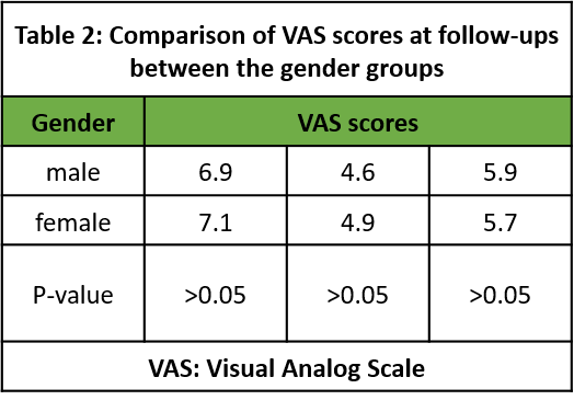 Table 2: Comparison of VAS scores at follow-ups between the gender groups