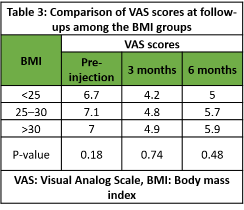 The table compares VAS scores across body mass index (BMI) categories at Pre-INJ, 3 months, and 6 months. Patients with BMI <25, 25–30, and >30 showed similar trends, with scores decreasing initially and slightly increasing by 6 months. No statistically significant differences were observed (P > 0.05), suggesting that BMI does not significantly influence pain reduction following the intervention (Table 4).