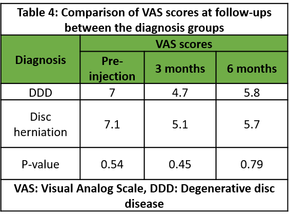 The table compares VAS scores between patients with DDD and disc herniation at Pre-INJ, 3 months, and 6 months. Both groups showed pain reduction, with scores stabilizing by 6 months. The P-values (>0.05) indicate no statistically significant difference between the groups, suggesting similar treatment responses irrespective of diagnosis (Table 5).