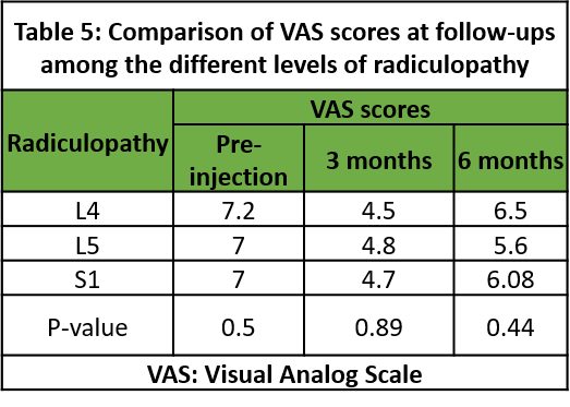 Table 5: Comparison of VAS scores at follow-ups among the different levels of radiculopathy