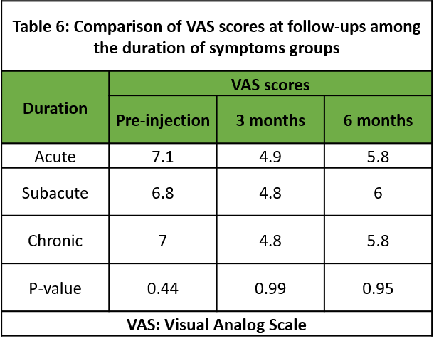 Table 6: Comparison of VAS scores at follow-ups among the duration of symptoms groups