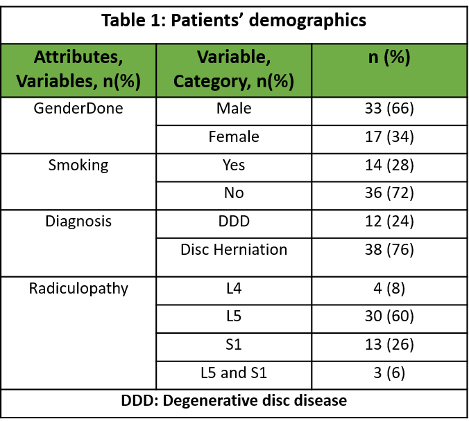The table summarizes demographic and clinical characteristics. Of 50 patients, 66% are male, and 34% are female. Smoking prevalence is 28%. Diagnoses include 24% with DDD and 76% with disc herniation. Radiculopathy affects L4 (8%), L5 (60%), S1 (26%), and L5-S1 combined (6%), highlighting L5 as the most common site (Fig. 1).