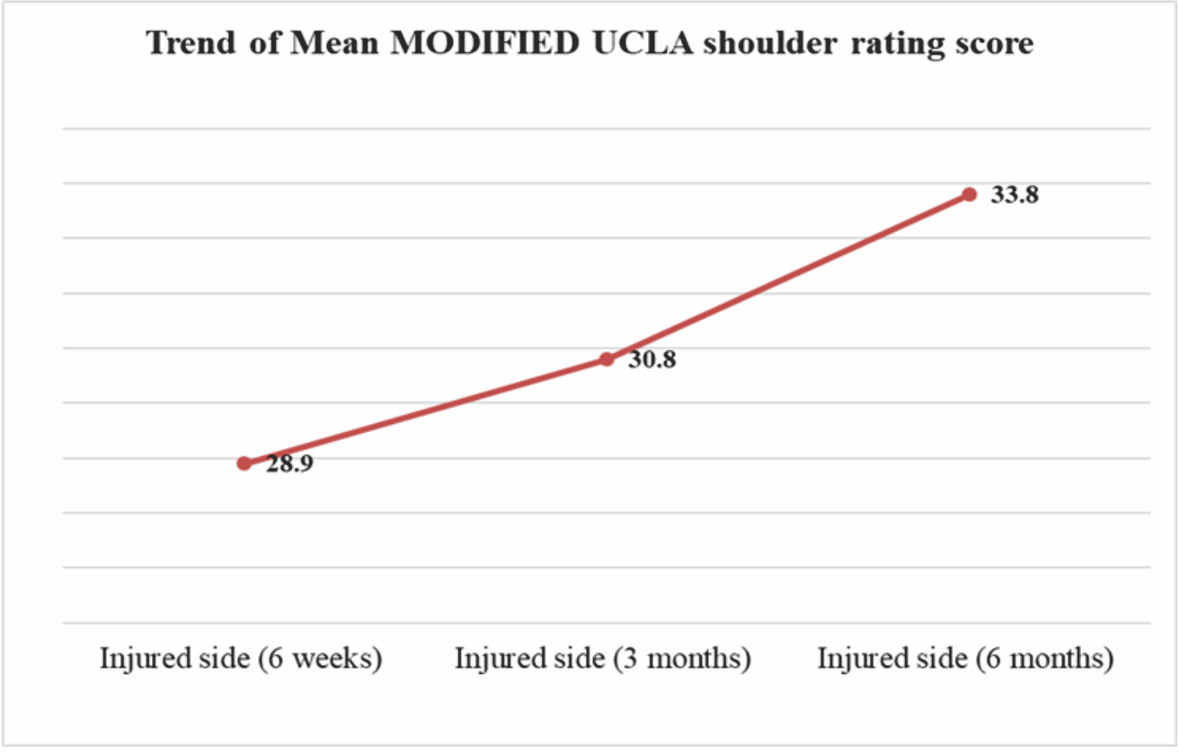 Figure 3: Trend of mean modified University of California Los Angeles shoulder rating score at injured side during post-operative period-6 weeks, 3 months, and 6 months.