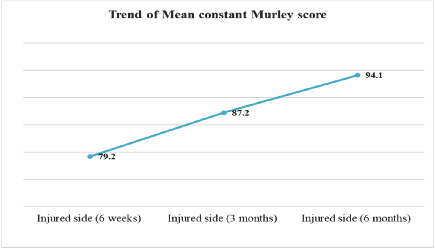 Figure 4: Trend of mean Constant-Murley score at injured side during post-operative period-6 weeks, 3 months, and 6 months.