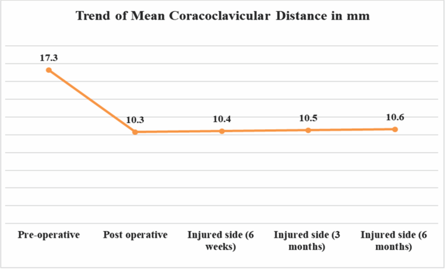Figure 5: Trend of mean coracoclavicular distance in mm at injured side during post-operative period-6 weeks, 3 months, and 6 months.