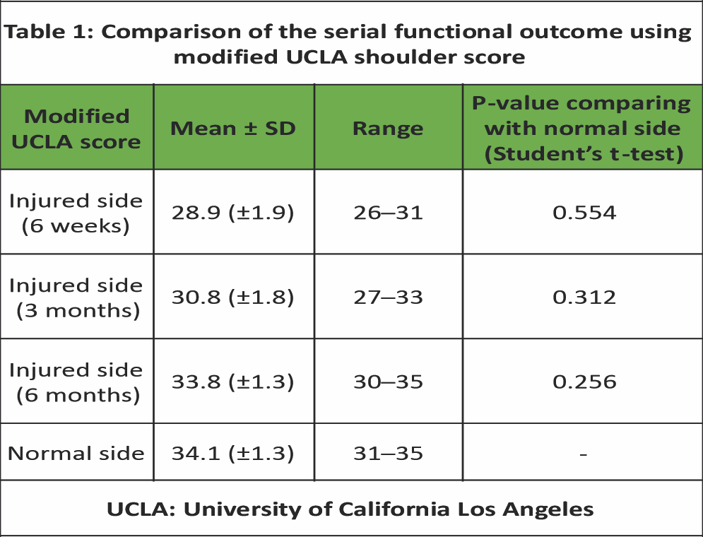 Postoperatively, intravenous antibiotics were given and the patients were discharged on the 3rd day. Gentle pendular exercises were started on the 3rd day and passive shoulder range of motion (ROM) exercises on the 7th day with restriction of shoulder abduction to 90 degrees. Assisted active motion was started at 2 weeks after suture removal. Patients were allowed both active and passive full range of movements after 4 weeks. Arm pouch was removed after 6 weeks. Clinical evaluation was performed at 6 weeks, 3 months, and 6 months using modified UCLA score and Constant-Murley score and compared with the pre-operative score of the normal shoulder. Radiographic assessment included coracoclavicular distance and fracture union