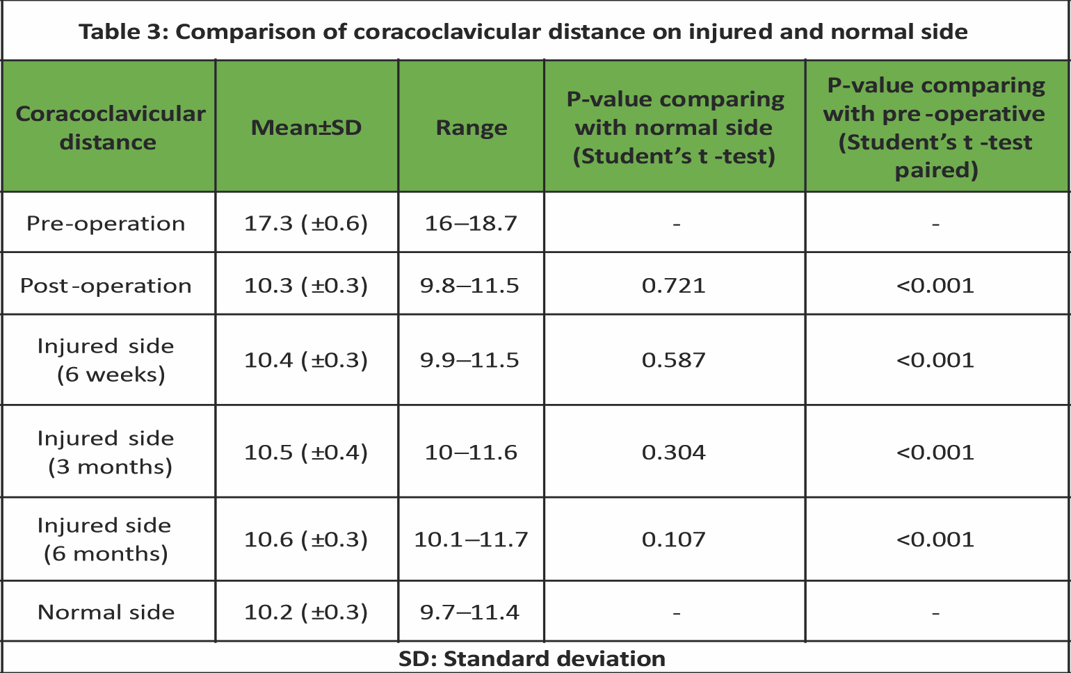 In Table 3, it is described the coracoclavicular distance at injured side during pre-operative phase, post-operative phase, and follow-up intervals at 6 weeks, 3 months, and 6 months along with the distance at the normal side.